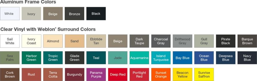 Vinyl screens deliver outstanding climate control, transforming outdoor spaces into multi-season rooms. A transparent plastic panel provides a view while the screen is down. Features your choice of colored fabric borders. Heavy-duty bottom bar is included.- Clear Vinyl with Weblon® Surround - Provides climate control to the enclosed space while a transparent plastic panel maintains the view.